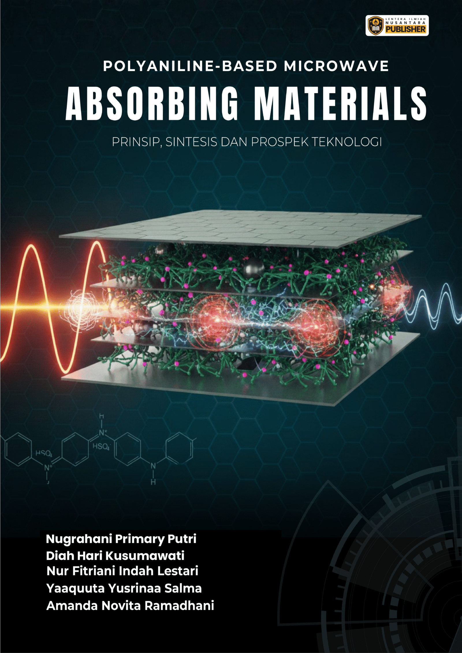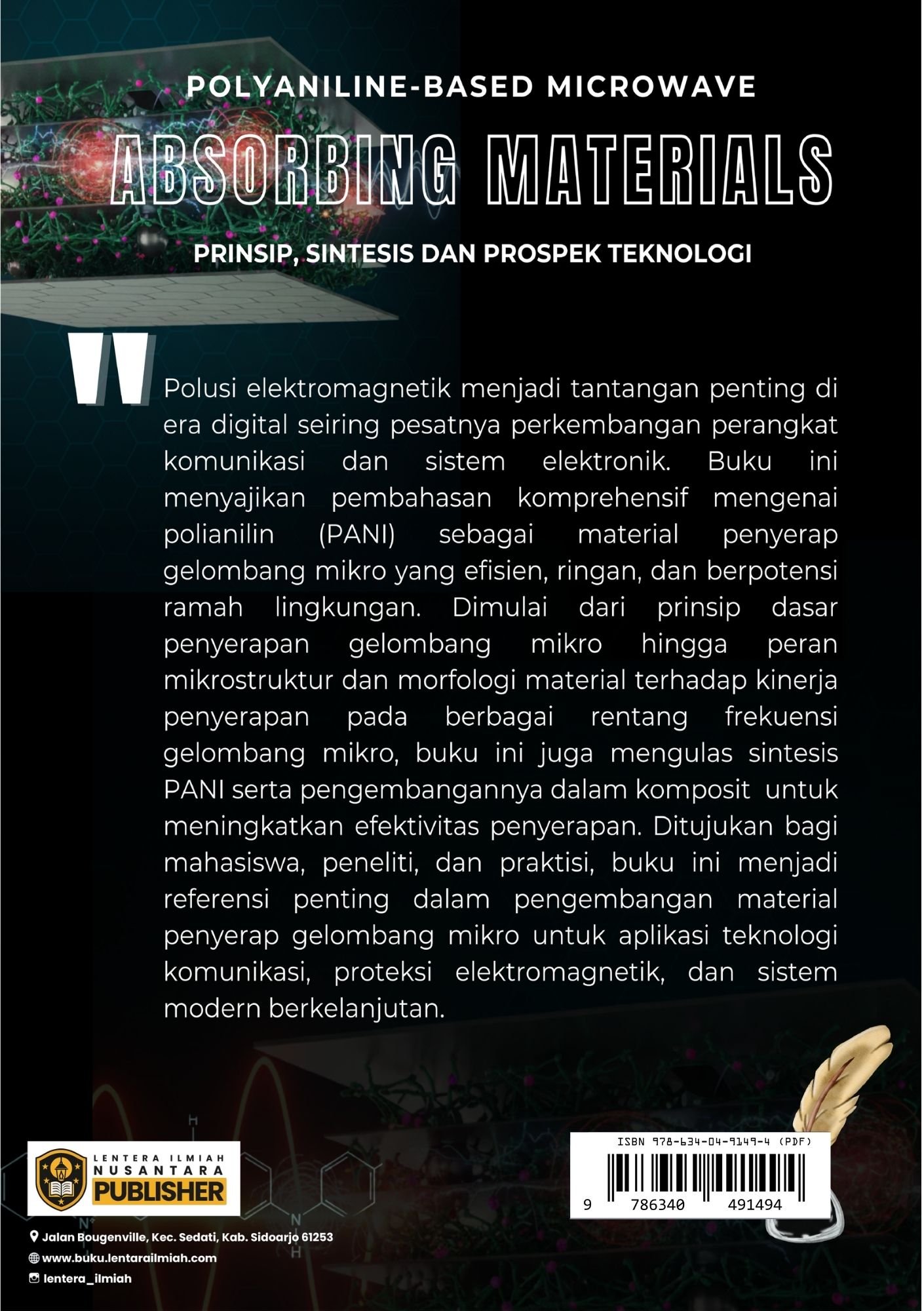 Polusi elektromagnetik menjadi tantangan penting di era digital seiring pesatnya perkembangan perangkat komunikasi dan sistem elektronik. Buku ini menyajikan pembahasan komprehensif mengenai polianilin (PANI) sebagai material penyerap gelombang mikro yang efisien, ringan, dan berpotensi ramah lingkungan. Dimulai dari prinsip dasar penyerapan gelombang mikro hingga peran mikrostruktur dan morfologi material terhadap kinerja penyerapan pada berbagai rentang frekuensi gelombang mikro, buku ini juga mengulas sintesis PANI serta pengembangannya dalam komposit untuk meningkatkan efektivitas penyerapan. Ditujukan bagi mahasiswa, peneliti, dan praktisi, buku ini menjadi referensi penting dalam pengembangan material penyerap gelombang mikro untuk aplikasi teknologi komunikasi, proteksi elektromagnetik, dan sistem modern berkelanjutan.